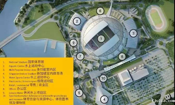新加坡体育中心包含的场地十分丰富,除了上面照片中明显的、拥有55,000个座位的国家体育场之外,它同时还拥有水上运动中心、多功能室内场馆及大量体育设备。