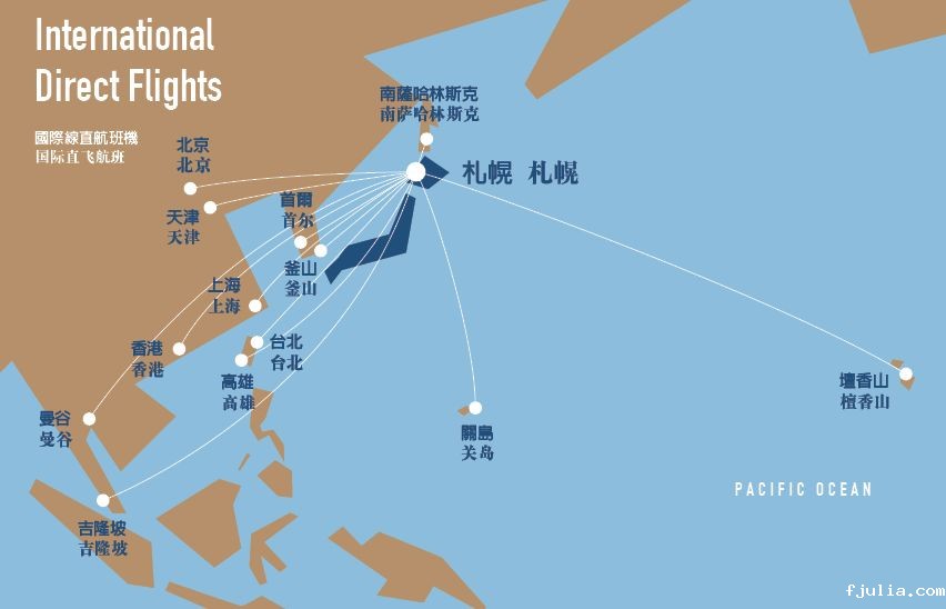 新千岁机场是离札幌最近的国际机场,目前开通了以亚洲为主的世界17座城市之间的直航航线。尤其,札幌现在已与北京、上海、天津、杭州及南京等城市之间开通了直飞航班,班次也在不断增加。