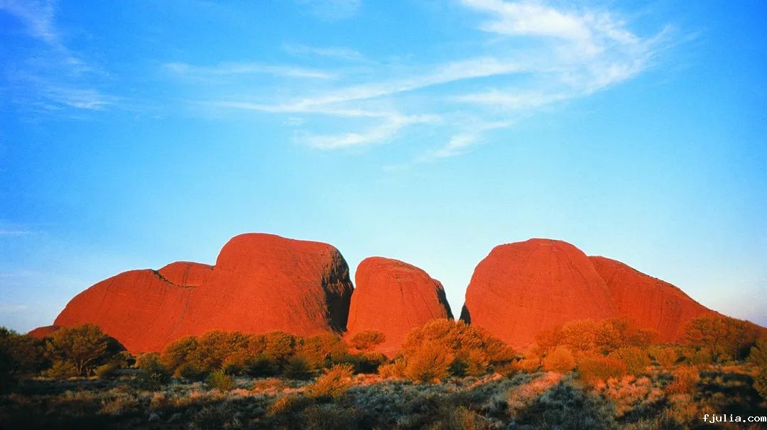 澳大利亚中部地区素以深红沙漠、无垠蓝天和壮美风景著称。这一片广阔区域称为澳大利亚内陆(Outback)的核心地带,以爱丽丝泉为中心,蜿蜒起伏的麦克唐纳山脉(MacDonnell Ranges)横亘其间。西边有瓦塔卡国家公园(帝王谷),往南有列入世界遗产名录的乌鲁鲁-卡塔丘塔国家公园(艾尔斯岩和奥尔加斯)。