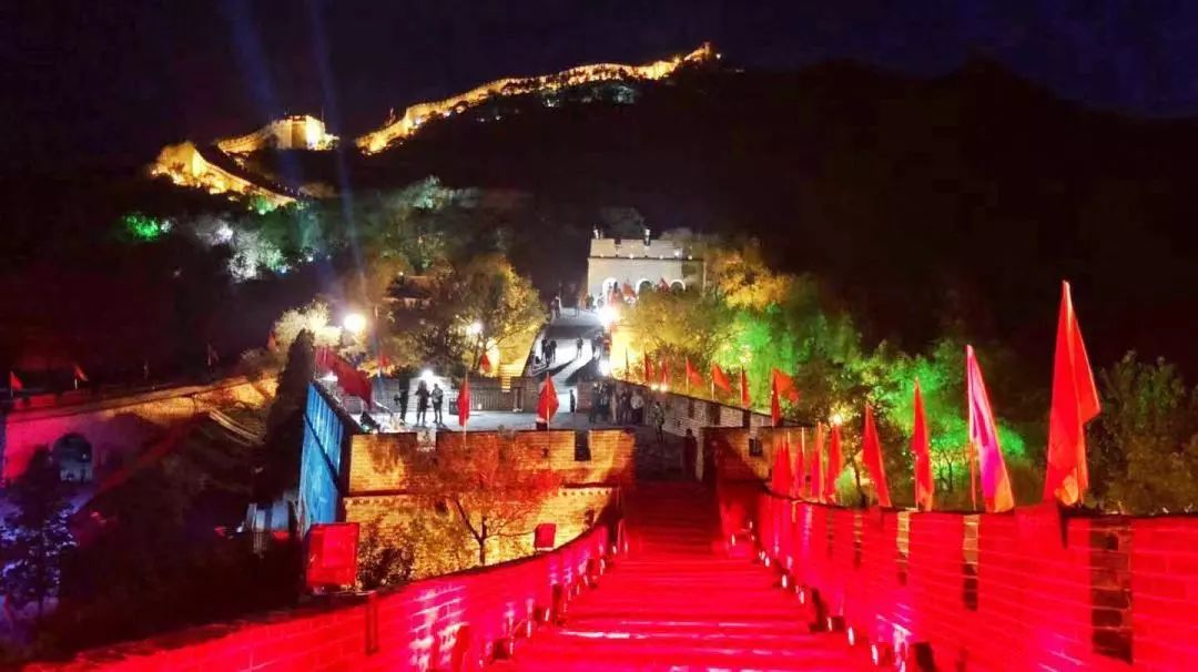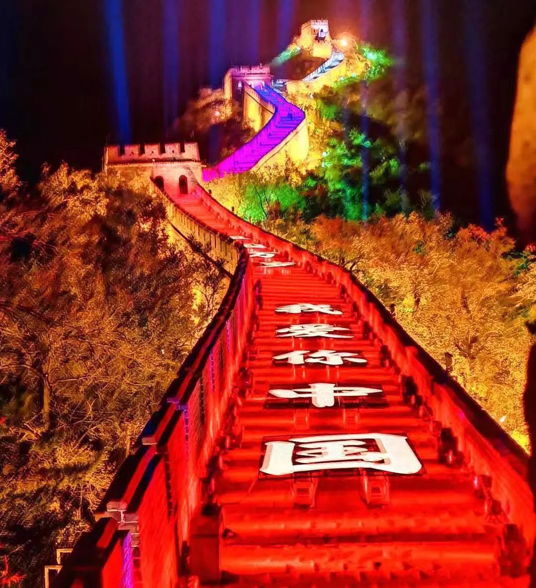 为保证此次灯光秀的壮观绚丽, 工作组精心筹备,提前多次踩点并用心设计搭建,用高超的工作水平和专业的行业实力按时保质保量完成了灯光秀的全部工作。本次600余台灯光秀全长340米,途径3栋长城瞭望台,与铺设在北一楼至北二楼马道中的9组冰屏共同组成“我爱你中国”“祖国万岁”立体金色大字,气势恢宏壮观,伴随着激昂的音乐,整个灯光串与夜色和古长城交相辉映, 用最美好绚丽的景致和最雄伟壮阔的气韵为伟大祖国献上衷心的生日祝福!