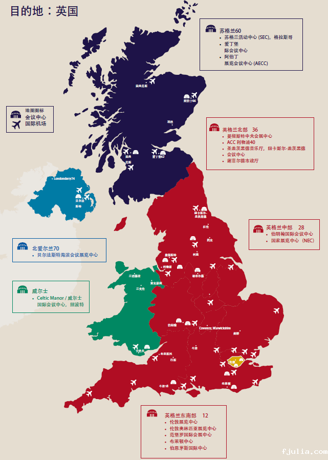 英国(UK)由英格兰、苏格兰、威尔士和北爱尔兰组成,是一个外向型,专注全球贸易的商业国度,拥有丰富多元的文化,欢迎世界各国人民和企业的光临。英国在多个行业领域均处于世界领先水平,包括创意产业、金融服务、航空技术、教育培训、人工智能、电子科技以及文学等等,而举办商务活动在其中占据着前排位置哦。
