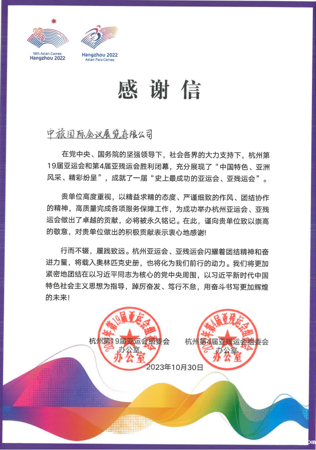 近日,中旅旅行所属点点网页版入口官网喜获杭州第19届亚运会组委会及第4届亚残运会组委会联名感谢信。信中对点点网页版入口官网精益求精的态度、严谨细致的作风、团结协作的精神及各项服务保障工作的高质量完成表示充分赞许,并对点点网页版入口官网团队为杭州亚运会、亚残运会成功举办所做出的卓越贡献与辛勤付出表示衷心感谢。