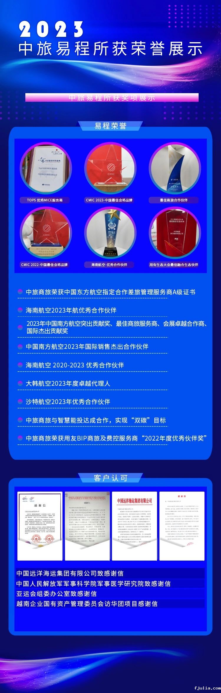 2023年,中旅旅行所属中旅易程紧紧围绕“集团管理服务提升年”有关精神,持续提升自身服务效能和夯实专业水平,赢得诸多来自客户、供应商伙伴的认可与赞许,荣获业界多类奖项。每一项荣誉都承载了中旅易程对每一个项目的精心打磨,蕴含着每一次服务中的自我创新与突破。